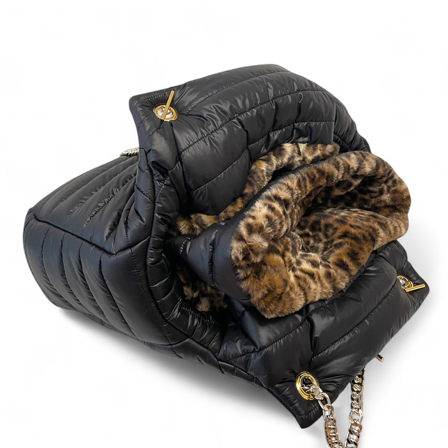 Il trasportino ultraleggero in piumino Baby Jaguar Puffer Bag è perfetto per il tuo gatto o cane di piccola taglia. Il design in ecopelliccia giaguaro lo rende elegante e accogliente per il tuo animale domestico, mentre il piumino garantisce calore e comfort durante i viaggi.