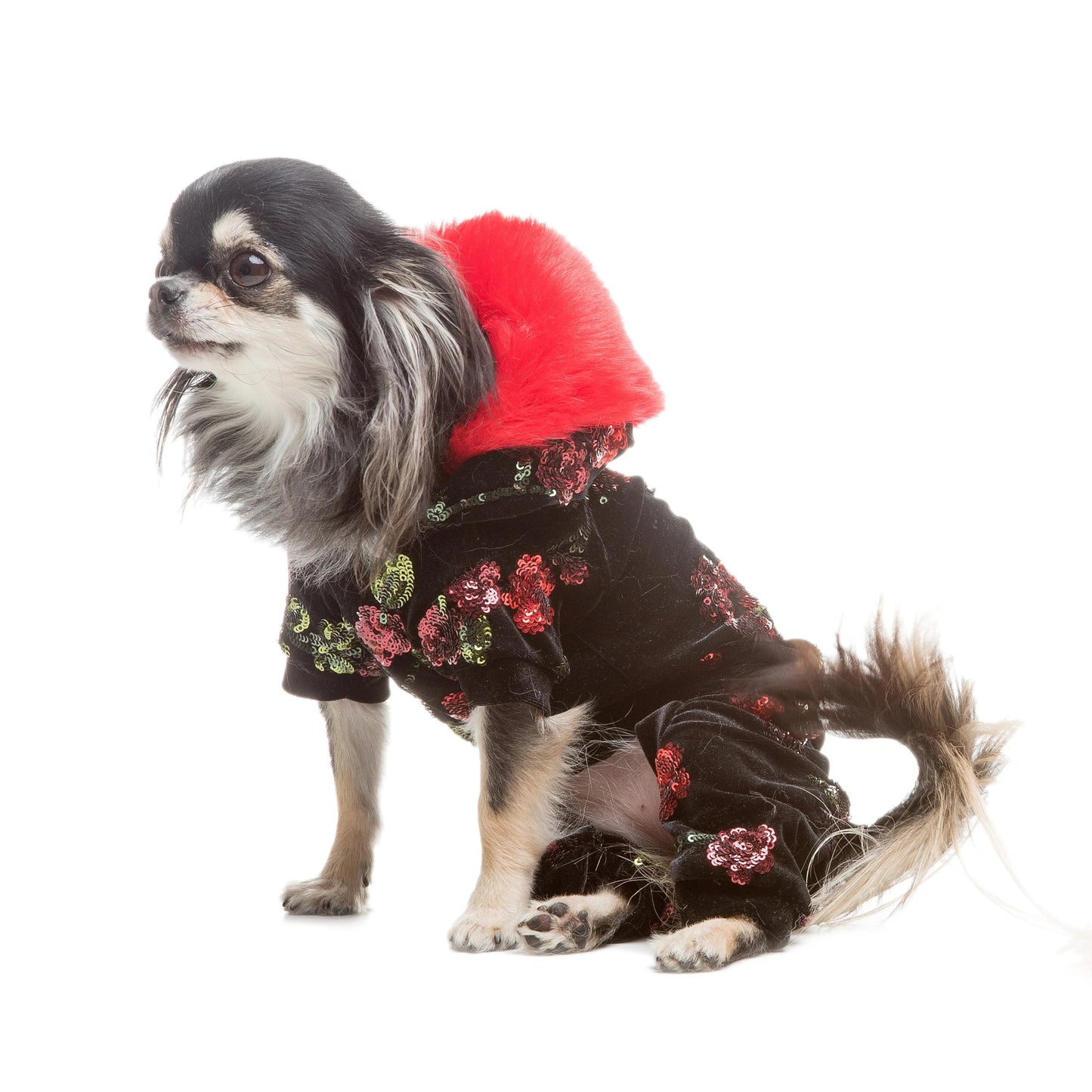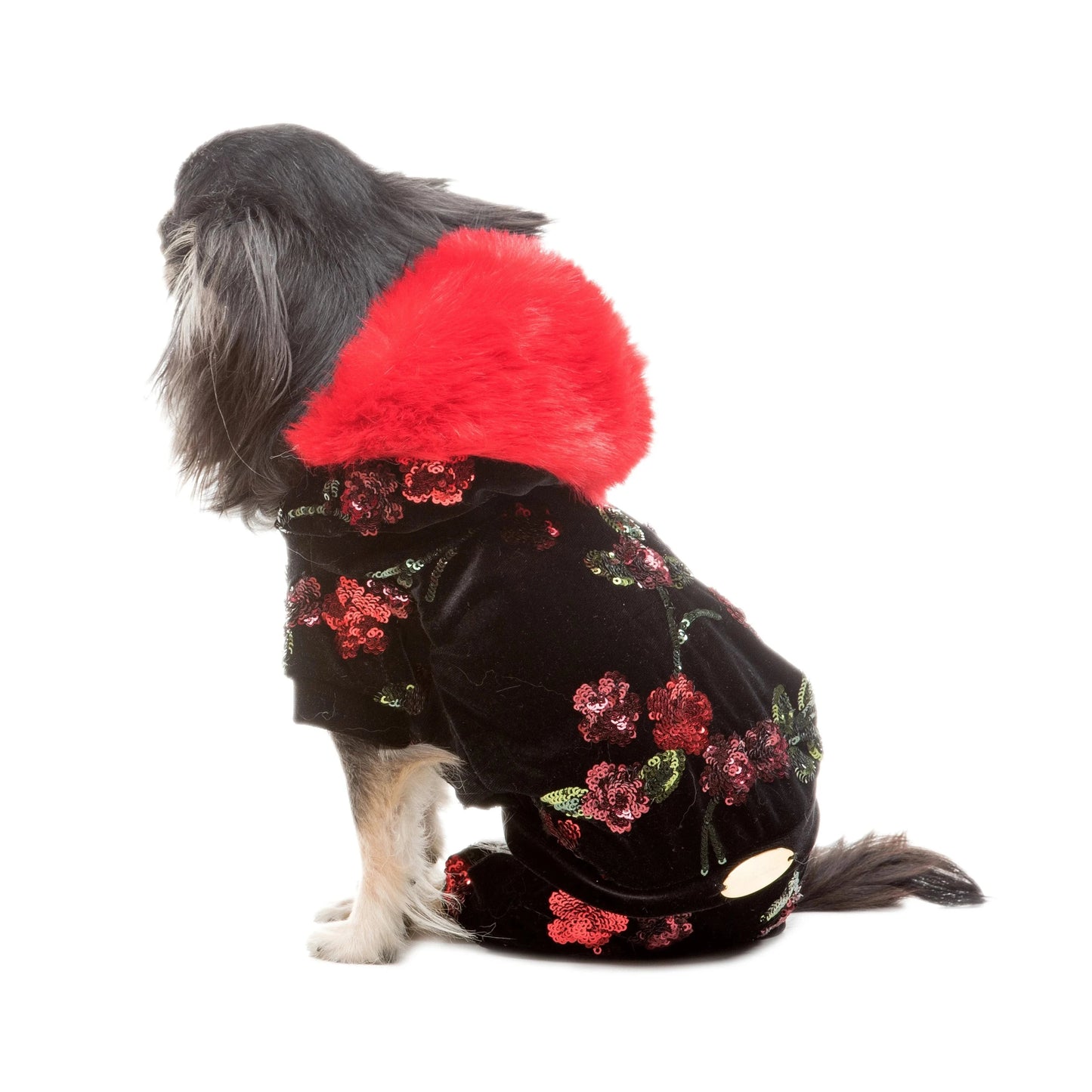 La fodera cappuccio pelliccia rossa contrasta con il nero, impreziosito da pregiati e raffinati ricami realizzati con micropaillettes, per rendere ancora più avvolgente l'esperienza del tuo cane, senza rinunciare alla raffinatezza.